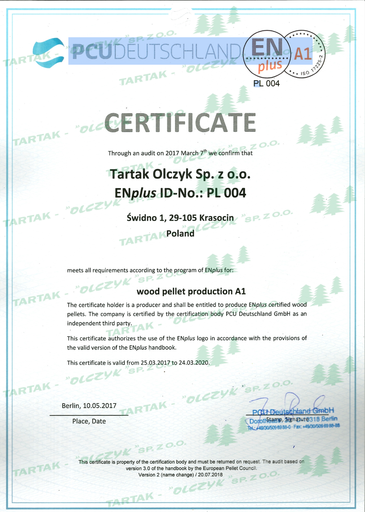 Die Qualität des Pellets Olczyk wird mit den renommiertesten europäischen Qualitätszertifikaten bestätigt (DIN-Plus und EN-Plus A1), die die Sägemühle Olczyk schon seit mehreren Jahren als einer der wenigen Hersteller in Polen hält. Unerlässlich bei der Herstellung von Pellet in der Sägemühle Olczyk ist die ständige Aufsicht und die betriebliche Qualitätskontrolle, die jede Stunde durch qualifizierte Arbeitskräfte durchgeführt wird.